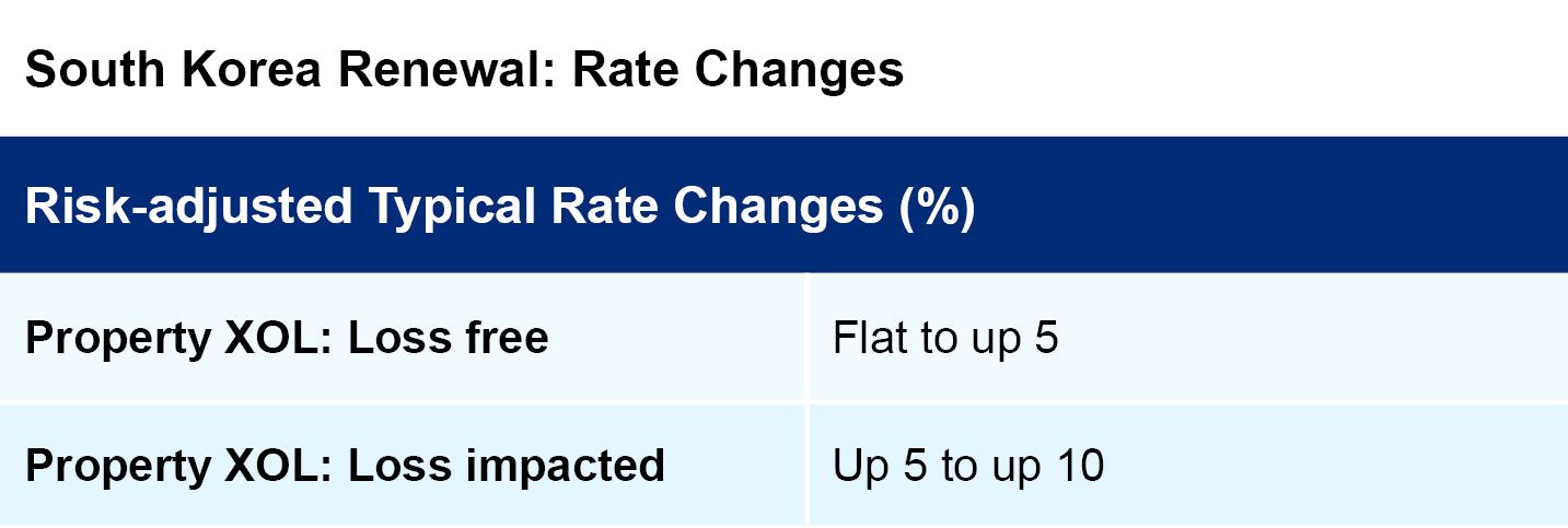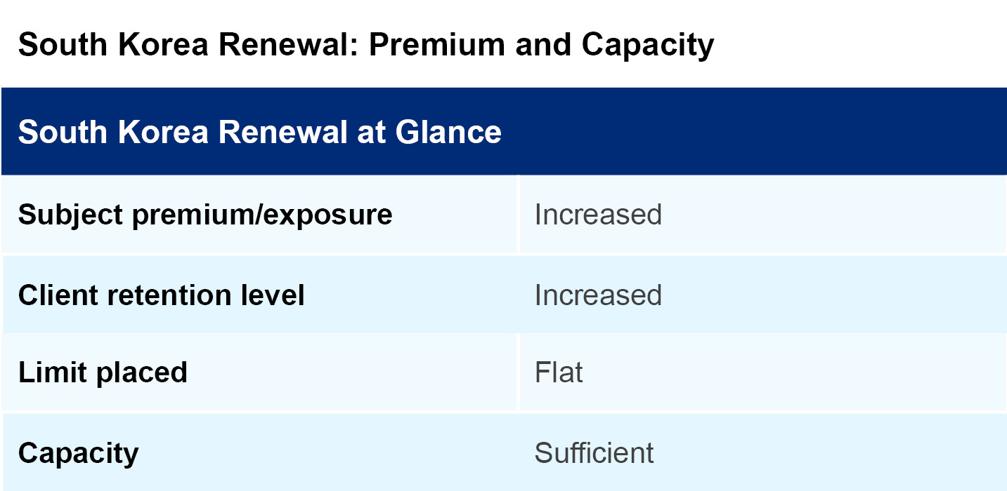 Prior to the April 1 reinsurance renewals in Korea, expectations for pricing increases were quite high. While Korea had not experienced any impactful losses in recent years, a mid-sized typhoon, heavy rain losses and several large single losses occurred in 2020, influencing the pre-renewal expectations. However, capacity was more than sufficient and certain markets were proactive as they sought potential cedents. Renewal Highlights: